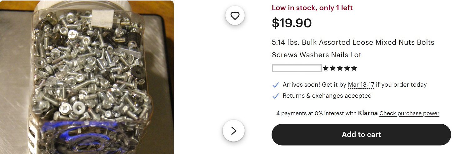 Currently on Etsy there’s an anxiety-inducing listing for 5-pounds of pre-owned nuts and bolts available for purchase for almost $20. And the lucky buyer gets to pay an ADDITIONAL $19.74 for shipping!